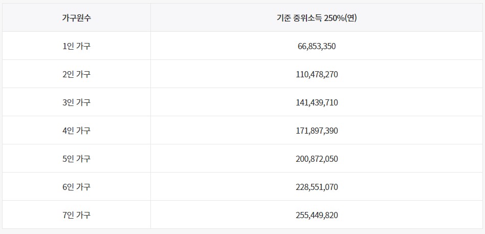 - 가구 전체 소득이 기준 중위소득 250% 이하여야 합니다.