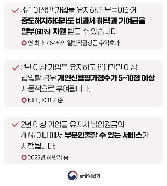 - 혜택 : 정부기여금, 은행금리, 이자소득 비과세