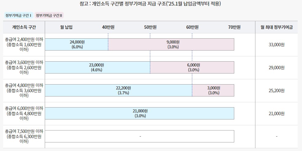 특히 월소득이 낮을수록 정부지원금이 더 많이 붙어서 혜택이 커집니다.