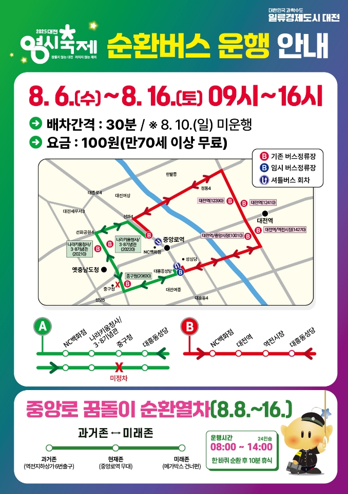 차량 통제(교통 통제)를 하는 대신 2025 대전 0시 축제 기간 동안에는 새벽 1시까지 지하철 연장 운행을 한다고 하니 가능하면 지하철을 이용하는 것을 추천드립니다.