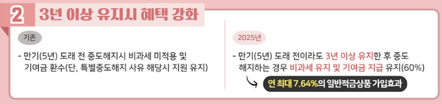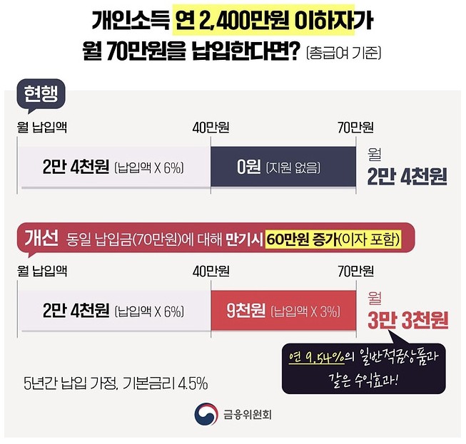 - 혜택 : 정부기여금, 은행금리, 이자소득 비과세